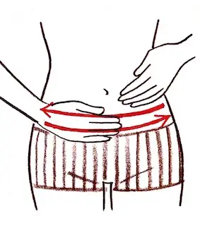 右手を左手のわき腹にあて、右へ引いて下腹部を大きくさすります。続けて左手を右の脇腹にあて、左へ引いて脇腹にあて、左へ引いて下腹部を大きくさすります。(両手で10回ずつ)