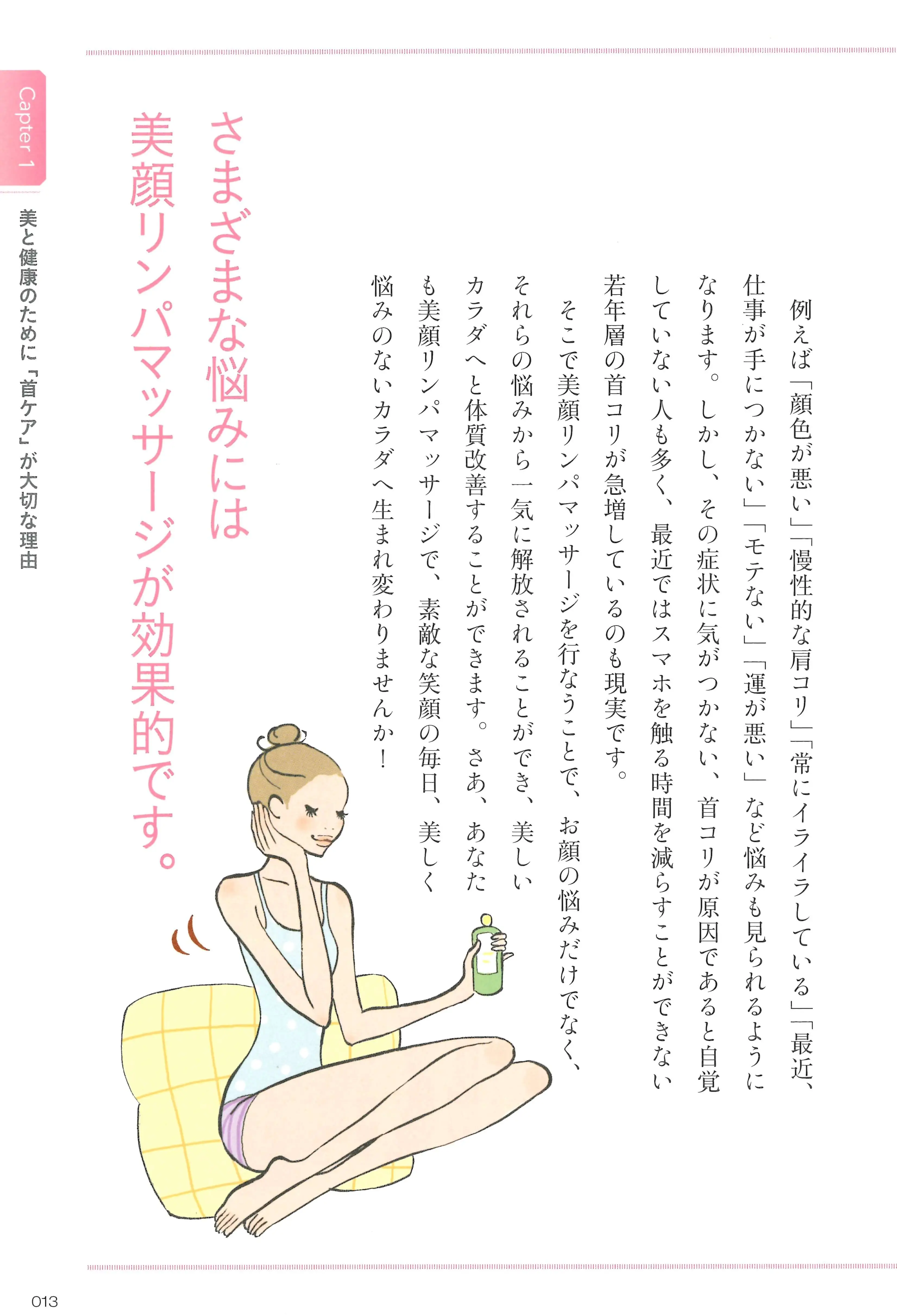 首コリは女性の美と健康の大敵。たとえば、首コリの方は、お顔のケアの前に、首のケアが必要です。自分に合うケアを行なわないと、本当の意味で満足できる効果を実感できないのです。毎日のケアで、自分自身の変化を感じ取って、自分の専門家になることが、あなたのキレイと健康にとって大切な要素なのです。